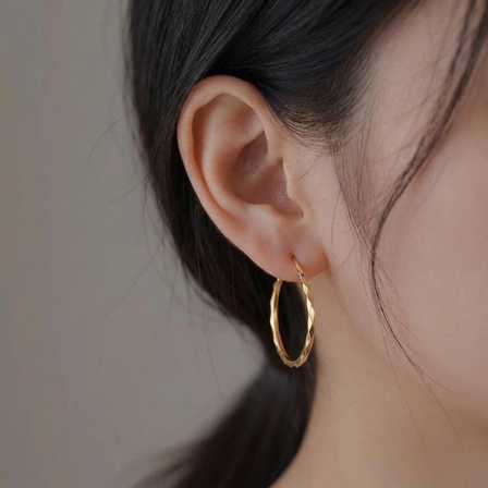 This full-surface diamond cut means these hoops produce noticeably more light reflection than smooth plain wire hoops of the same size, despite being an entirely plain gold piece with no stones or additional decoration.