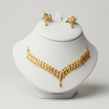 This 21 carat gold necklace and earring set is built around an open filigree leaf or teardrop link design that gives the set a light, breathable character despite being a full gold jewellery set. The set includes a V-shaped collar necklace and a pair of matching stud or small drop earrings, all constructed in the same filigree leaf form that unifies the pieces visually when worn together.