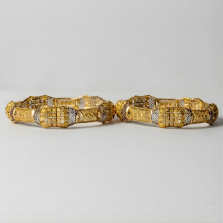A pair of 21 carat gold bangles with a total weight of 33.750 grams. Each bangle features an open filigree gold body with granulation detailing, structured panel sections, and white zirconia stone inserts at the center panels. A heavyweight real gold bangle pair with detailed traditional craftsmanship, suitable for women for weddings, Eid, and special occasions.