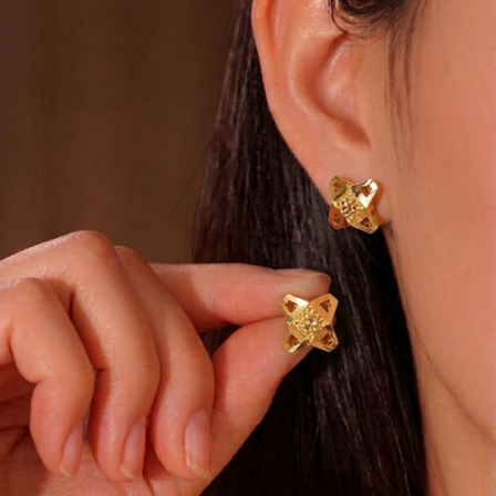 These small 21 carat gold tops stand out from the usual flower stud with a strong four point star or cross shape that has a more geometric, structured look. Each earring is built with four pointed arms extending from the center, with open square cutwork windows cut into each arm. The surface of the gold has a natural rough texture from the casting process, giving it a raw, organic finish that contrasts with the clean geometric shape.