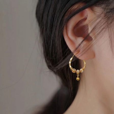 At the bottom center of each hoop — below the middle barrel bead — a small plain polished gold ball hangs as a drop. This ball drop adds a vertical element to the lower section of the hoop, giving a slight pendant quality to the earring that makes it more dynamic than a flat hoop with beads alone. The ball drop moves gently during wear, adding subtle movement to the earring. The plain polished surface of the drop ball contrasts against the diamond cut textured surface of the barrel beads above it, giving a two-finish detail to the charm section of each earring.
