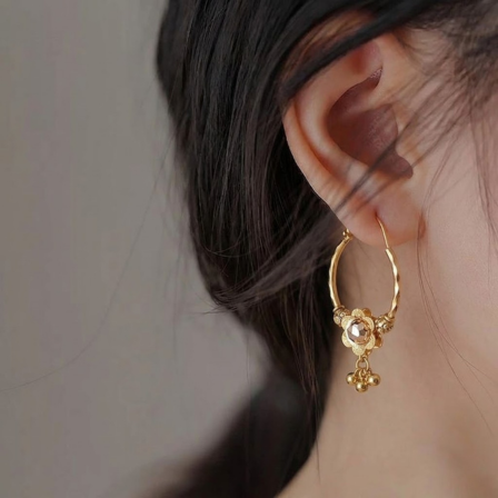 - Style: Hoop earrings with flower centerpiece and jhumka ball drop