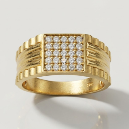 21 carat gold men’s ring weighing 9.310 grams, set with real diamonds. Features a flat square top face fully paved with round diamonds in a grid arrangement, wide ribbed president style band with diagonal bar detailing on both shoulders, and a matte brushed gold finish throughout. A very heavyweight real diamond gents ring with a clean, structured design suitable for daily wear, Eid, weddings, and formal occasions.