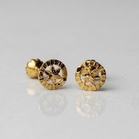 Small 21 carat gold round stud earrings weighing 0.660 grams. Each top features a circular diamond cut outer ring with an open cutwork star shape in the center. A lightweight plain gold top with a classic design, suitable for babies, kids, and women for daily and occasional wear.
