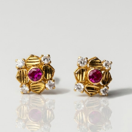 21 Carat Gold Ruby and White Zirconia Flower Stud Earrings | 1.030g Pure Gold