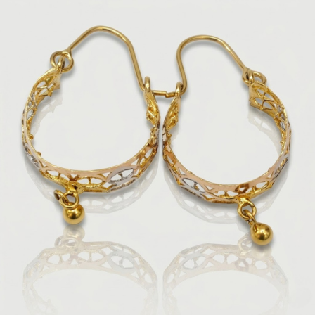 21 Carat Gold Two-Tone Filigree Hoop Earrings with Ball Drop | 2.760g