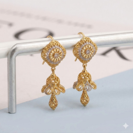 A genuine and lasting gift for a daughter, sister, mother, or wife who wants a traditional real gold drop earring with detailed filigree work and two-tone finishing.