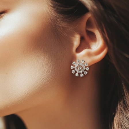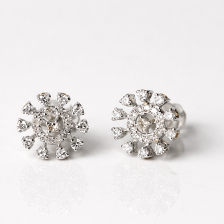 21 carat white gold diamond stud earrings weighing 2.820 grams, set with real diamonds. Each top features a sunburst or starburst design — a central diamond cluster surrounded by an outer ring of prong-set round diamonds with single diamonds extending outward on fine prong tips. A real diamond earring with a bold, bright design suitable for women for weddings, Eid, formal occasions, and gifting.