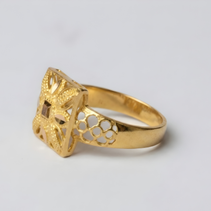 It is accented with small natural diamonds set on both sides of the ring, along with subtle white gold or silver highlights that create beautiful contrast against the rich 21 carat yellow gold.