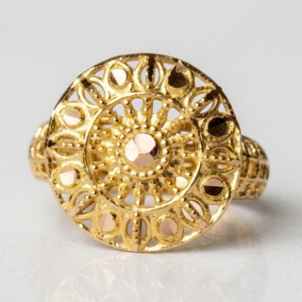 This delicate 21K gold baby ring is crafted in an ultra-lightweight 0.600 gram design, perfect for newborns, infants, and toddlers. The ring features an intricate openwork floral mandala pattern with fine gold filigree work and detailed scrollwork throughout.