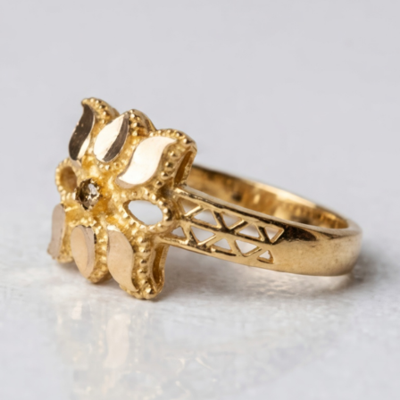 The top of the ring showcases a floral-style pattern created through fine cutwork detailing. The open design reduces overall weight while maintaining the strength of the gold. Small petal-like shapes and a central textured element give the ring a classic look that stands out without being bulky.