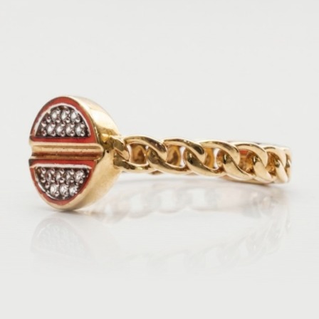 This solid 21K gold men’s ring weighs exactly 3.130 grams and showcases a bold Cuban link chain design that gives it a strong, masculine look. The standout feature is its round centerpiece with a rich red enamel background, divided by a horizontal gold bar. Both the upper and lower halves of the centerpiece are fully pavé-set with sparkling natural diamonds, creating a striking contrast against the vibrant red enamel and shining 21 carat gold.
