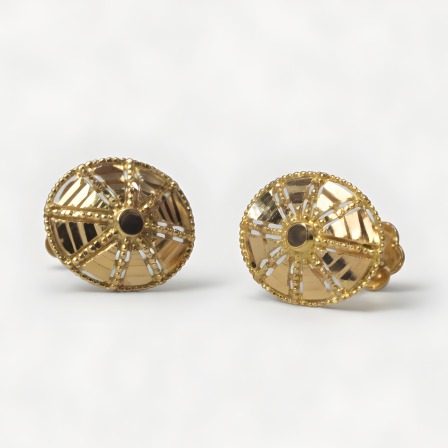 These 21K gold stud earrings are designed with a round filigree pattern, featuring fine openwork detailing that creates a balanced and detailed look. With a total weight of 0.880 grams, they are light enough for all-day wear while still maintaining a solid gold feel. The circular shape combined with the intricate cutwork gives a traditional touch without making the design heavy or overdone.
