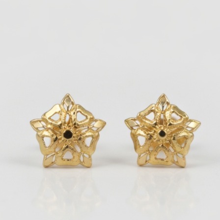 21 Carat Gold Star Flower Design Stud Earrings weighing only 0.980 grams. Delicate openwork floral pattern with a small black stone center. Perfect for daily wear or special occasions.